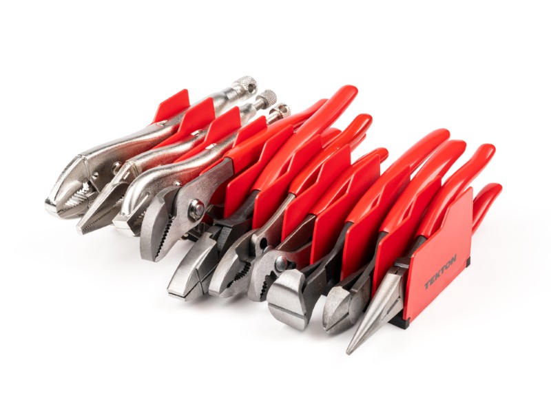 INCLUDED IN THIS SET10 Inch Groove Joint Pliers (1-1/2 in. Jaw) - Sharp, angled pipe-wrench-style teeth get a sure bite - Undercut tongue and grooves interlock for superior joint strength - Adjustable nut and bolt fastener can be set to desired tension ![]() 7 Inch Angle Nose Slip Joint Pliers (7/8 in. Jaw) - Sharp, angled pipe-wrench-style teeth get a sure bite - Slip joint design adjusts to three positions - Adjustable nut and bolt fastener can be set to desired tension ![]() 8 Inch Slip Joint Pliers - Universal 3-zone jaws grip multiple shapes and cleanly shear wire - Slip joint design adjusts to two positions - Adjustable nut and bolt fastener can be set to desired tension ![]() 8 Inch Long Nose Pliers - Long, tapered nose with fine tip - Crosscut teeth distribute force evenly for sure grip in any direction - Wire cutter cleanly snips copper, aluminum, and other soft metals ![]() 7 Inch Diagonal Cutting Pliers - Blades are finely beveled and induction-hardened to 58–64 HRC to produce a refined semi-flush cut - The 82-degree angle allows for a strong yet sharp blade for a smooth clean cut ![]() 8 Inch End Cutting Pliers - Blades are finely beveled and induction-hardened to HRC 60-63 to produce a refined semi-flush cut - Induction hardened blades make them extremely durable and able to cut tougher materials ![]() 9-1/2 Inch Lineman's Pliers - Jaws can bend thin, flat pieces like metal tabs, mounting brackets, and cable clamps to a crisp right angle - Crosscut teeth distribute force evenly for grip in any direction ![]() 7 Inch Straight Jaw Locking Pliers - Straight jaw profile holds flat stock and sheet materials - Pull-type release lever works like a trigger for controlled one-handed operation and fast repositioning - Generously sized tension adjustment knob offers a large, nonslip knurled surface and a through hole for added leverage with a second tool ![]() 9 Inch Long Nose Locking Pliers - Long nose straight jaw with curved profile section reaches into narrow spaces and holds round, hex, and square shapes, flat stock, and sheet materials - Pull-type release lever works like a trigger for controlled one-handed operation and fast repositioning - Generously sized tension adjustment knob offers a large, nonslip knurled surface and a through hole for added leverage with a second tool ![]() 10 Inch Curved Jaw Locking Pliers - Curved jaw profile with straight tips holds round, hex, and square shapes, flat stock, and sheet materials - Pull-type release lever works like a trigger for controlled one-handed operation and fast repositioning - Generously sized tension adjustment knob offers a large, nonslip knurled surface and a through hole for added leverage with a second tool ![]() 10-Tool Pliers Organizer Rack - Storage rack keeps pliers upright and organized, making them easy to grab, and saving space in toolbox drawers or tabletop surfaces - At 2.7 inches tall, the pliers rack fits well in most toolbox drawers ![]() |