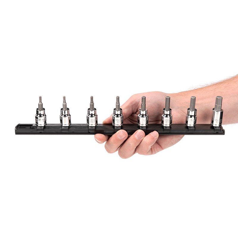 Strong, Precise Hex Bits - Bits are made of S2 heat-treated steel - The 6-sided hexagonal tip is machined to precise tolerances for an exact fit with hex fasteners ![]() Straight, Permanent Connection - Bits are pressed directly into the socket for a permanent connection - The carefully controlled process ensures bits are exceptionally straight - A tightly mated fit means bits will not loosen over time or under stress ![]() Large, Stamped Markings - Permanently impressed into the material by a roll-stamp die - As large as possible while still being readable along the socket’s curved surface - Clearly visible size numbers with extra-deep outline ![]() Secure Drive Tool Engagement Detent grooves and beveled edges provide a smooth and secure connection with the drive tool. ![]() - Patented twist-to-lock design securely holds sockets on the rail - Keyhole slot mounts to wall or workbench - Combine multiple socket rails with trays and other accessories ![]() |