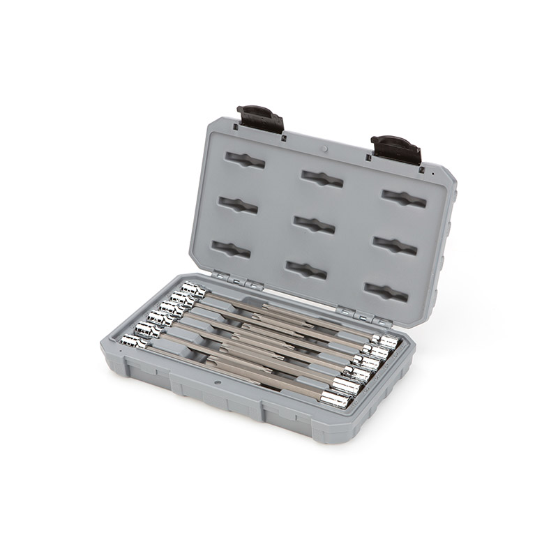 Strong, Precise Torx® Bits - Bits are made of S2 heat-treated steel - The star-shaped bit has 6-lobes machined to precise tolerances for an exact, high-torque fit on Torx® fasteners that resists camming out ![]() Long Reach Bits Extra-long bits allow you to reach deep into narrow, recessed areas. ![]() Straight, Permanent Connection - Bits are pressed directly into the socket for a permanent connection - The carefully controlled process ensures bits are exceptionally straight - A tightly mated fit means bits will not loosen over time or under stress ![]() Large, Stamped Markings - Permanently impressed into the material by a roll-stamp die - As large as possible while still being readable along the socket’s curved surface - Clearly visible size numbers with extra-deep outline ![]() Secure Drive Tool Engagement Detent grooves and beveled edges provide a smooth and secure connection with the drive tool. ![]() - Resilient high-density polyethylene material withstands exposure to common lubricants, fuels, and solvents - Strong latches and metal hinge pins - Molded size markings for each tool inside the case ![]() |