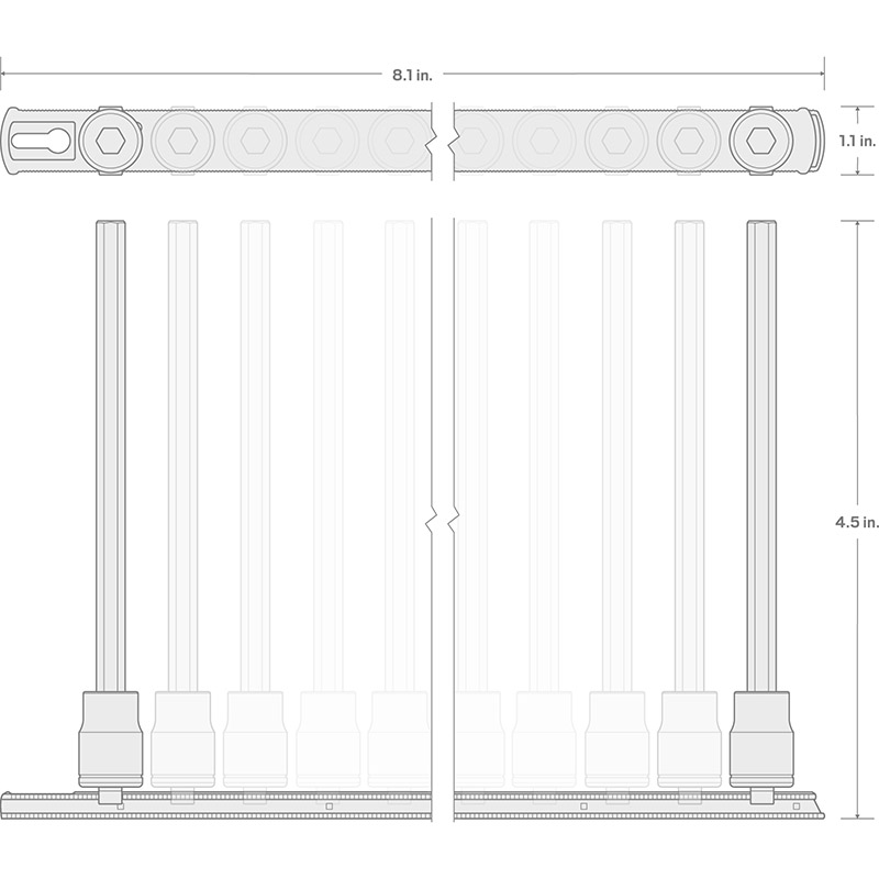 ![]() Large, Stamped Markings - Markings are permanently impressed into the material by a roll-stamp die - Sizes are as large as possible while still being readable along the socket's curved surface surface ![]() Secure Drive Tool Engagement - Four detent grooves provide a secure connection with the retaining ball of a drive tool - Beveled inner rims help guide the socket onto other tools ![]() - Patented twist-to-lock design securely holds sockets on the rail - Keyhole slot mounts to wall or workbench - Combine multiple socket rails with trays and other accessories ![]() |