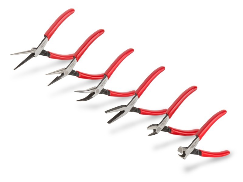 INCLUDED IN THIS SETMini Needle Nose Pliers (Serrated Jaw) - Extra long and slender, tapered nose with a fine tip - Crosscut teeth create uniform contact across jaw for sure grip in any direction ![]() Mini Long Nose Pliers - Long, tapered nose with fine tip - Crosscut teeth distribute force evenly for sure grip in any direction - Wire cutter cleanly snips copper, aluminum, and other soft metals ![]() Mini Bent Long Nose Pliers - Long, tapered nose with fine tip is bent to 45 degrees to reach around obstructions - Crosscut teeth distribute force evenly for sure grip in any direction - Teeth are cut along the full length of jaw, not just at the tip, maximizing useful contact area ![]() Mini Flat Nose Pliers (Serrated Jaw) - Broad, straight-edged jaws securely grasp flat parts and offer extra leverage for twisting or bending - Crosscut teeth distribute force evenly for sure grip in any direction - Teeth are cut along the full length of jaw, not just at the tip, maximizing useful contact area ![]() Mini Diagonal Cutting Pliers - Blades are finely beveled and induction-hardened to HRC 60-63 to produce a refined semi-flush cut - Cuts soft wire like copper, aluminum, brass, and silver (14-38 AWG) and trims plastic parts - Face is offset 15 degrees from handles to allow clearance for fingers ![]() Mini End Cutting Pliers - Blades are finely beveled and induction-hardened to HRC 60-63 to produce a refined semi-flush cut - Cuts soft wire like copper, aluminum, brass, and silver (14-38 AWG) and trims plastic parts ![]() |