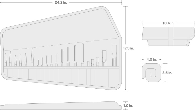 Four Punch and Chisel Types Each tip is carefully machined to meet exact tolerances. ![]() ![]() Individually Heat Treated Each punch and chisel is individually heat treated to harden and strengthen the tip while maintaining the soft temper of the striking end. - The striking end absorbs hammer blows without chipping. ![]() ![]() Materials and Finish Made from 5160 high carbon steel and finished with a dry, rust-preventative coating. ![]() Clear Markings Tekton punch and chisel sizes are marked with a high-visibility laser marking. ![]() Organization FeaturesIdeal for On-the-GoCarry your punch set anywhere with the compact roll-up pouch that keeps punches well-packed and unable to slide out. The pouch is specifically designed for the punches and chisels in our 20-piece set. ![]() Durable Material The polyurethane-backed 600 x 600 denier polyester is both abrasion and tear resistant, and has a Durable Water Repellent (DWR) coating. ![]() |