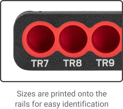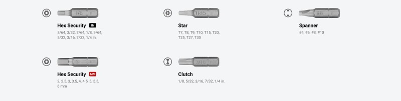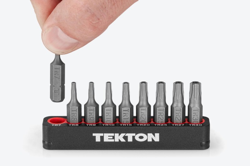 Security Bit Sizes Included ![]() Extra Length While standard bits are 25 mm long, every bit in this set is 30 mm long to improve your access to recessed fasteners. ![]() Corrosion Resistant The bits are made of S2 steel heat-treated to HRC 58-62. They're coated with a zinc-phosphate coating that resists corrosion. ![]() Clear Markings The tip size and Tekton “T” is clearly stamped onto every bit. ![]() Free-Standing Bit Rails The flexible rails securely grip the bits so they can’t fall out, while also making it easy to remove any bit one-handed. The rails can also stand upright on a surface. ![]() ![]() Full-Sized, Comfortable DriverMagnetic Bit ReceiverThe bits are held onto the end of the driver by a magnet that’s friction-fit within the receiver so that it can’t fall out. ![]() Three-Sided Geometry for Torque The handle’s three-sided geometry provides the leverage you need to generate high turning force by hand. ![]() Rounded Areas for Quick Spinning Round sections at the front and back ends of the handle create an ideal shape for quickly spinning long fasteners. ![]() Durable, Nonslip Handle The overmolded grip is permanently bonded to the handle and won't degrade or become sticky over time. ![]() ![]() Compact Carrying Case Round sections at the front and back ends of the handle create an ideal shape for quickly spinning long fasteners. ![]() |
