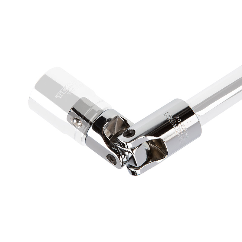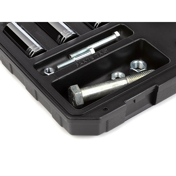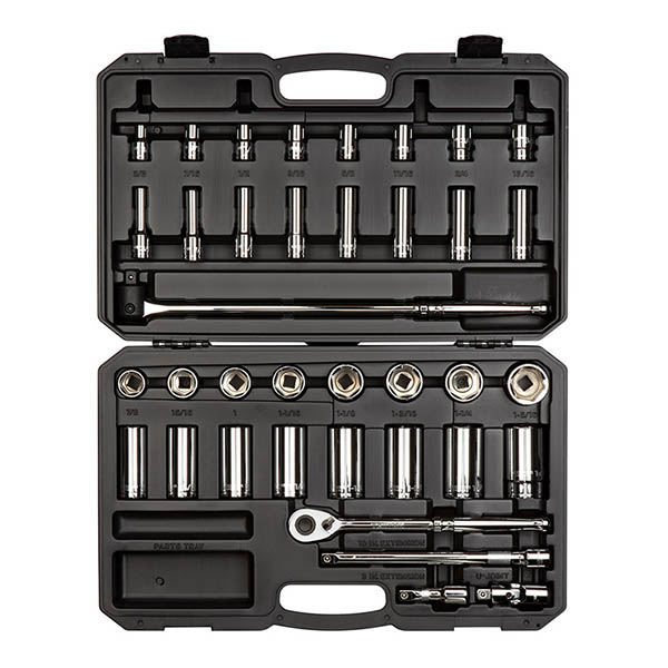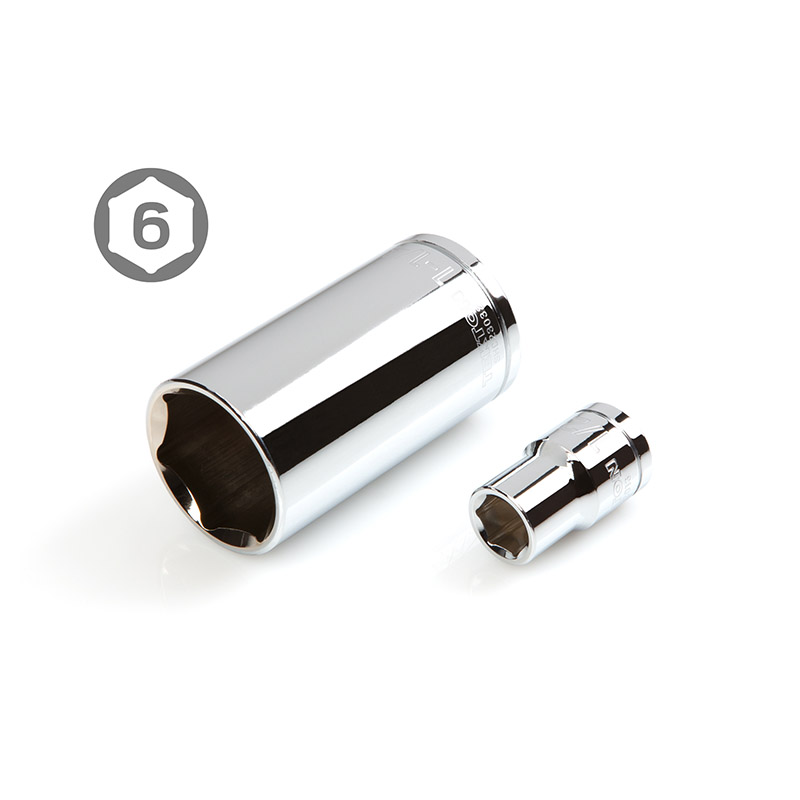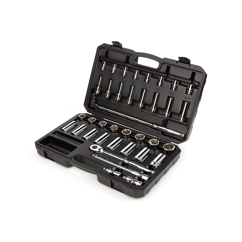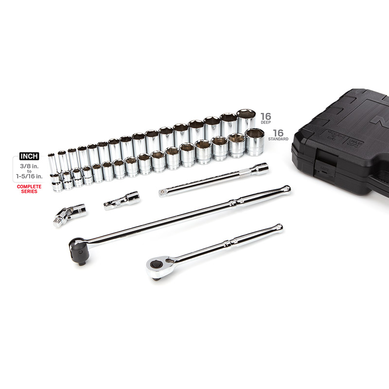 Large, Stamped Markings - Permanently impressed into the material by a roll-stamp die. - As large as possible while still being readable along the socket's curved surface - Clearly visible size numbers with extra-deep outline ![]() Fully Stepped Shoulders Narrowed diameter stretches to the base of the socket on small, deep-length sizes. This provides greater reach into tight, recessed areas. ![]() ![]() Exterior and Interior Finishes - Chrome-plated exterior is highly corrosion resistant and wipes clean to a mirror finish. - Interior is protected against rust with clear coat, rather than commonly-used metallic paint. ![]() 6-Point Socket Opening Get more access positions for multiple types of fasteners. ![]() Prevents Fastener Round-Off Radiused corners prevent fastener round-off by applying force to a fastener's flat sides, rather than its corners. ![]() Secure Drive Tool Engagement Detent grooves and beveled edges provide a smooth and secure connection with the drive tool. ![]() High Torque Strength Meets minimum value of 1.2 times the ANSI standard for Proof Torque. Verified by a single-cycle test that applies torque until specified value is reached without failure or permanent deformation. ![]() 90-Tooth Ratchet - 4-degree swing arc - Ultra-compact head is reduced in all dimensions - Quick-release drive locks sockets onto tang and releases with the press of a button ![]() Breaker Bar - 230-degree pivoting head without preset positions - 18 inch long handle for increased leverage ![]() Included Accessories3 and 10 Inch ExtensionsReach past obstructions and into tight spaces. Knurled band provides grip for starting or turning loosened fasteners. ![]() Universal Joint Pin-style joints rotate smoothly and continuously to access fasteners at up to 55-degree angles. ![]() Carrying Case - High-density polyethylene material withstands common lubricants, fuels, and solvents - Carrying handle, strong latches, and metal hinge pins - Molded size markings for each tool and a deep parts tray ![]() |