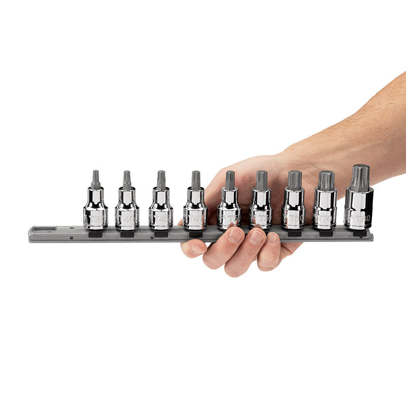 Strong, Precise Steel Bits - Made from heat-treated S2 steel for a hardened bit that holds fine geometry over time - The star-shaped bit has 6-lobes machined to precise tolerances for an exact, high-torque fit on Torx® fasteners that resists camming out ![]() Straight, Permanent Connection - Bits are pressed directly into the socket for a permanent connection - The carefully controlled process ensures bits are exceptionally straight - A tightly mated fit means bits will not loosen over time or under stress ![]() Large, Stamped Markings - Permanently impressed into the material by a roll-stamp die - As large as possible while still being readable along the socket's curved surface - Clearly visible size numbers with extra-deep outline ![]() Secure Drive Tool Engagement Detent grooves and beveled edges provide a smooth and secure connection with the drive tool. ![]() Portable Storage Rail Keep your sockets organized and ready to go using the included storage rail. The twist-to-lock clips hold sockets securely and can be repositioned anywhere along the rail. ![]() |