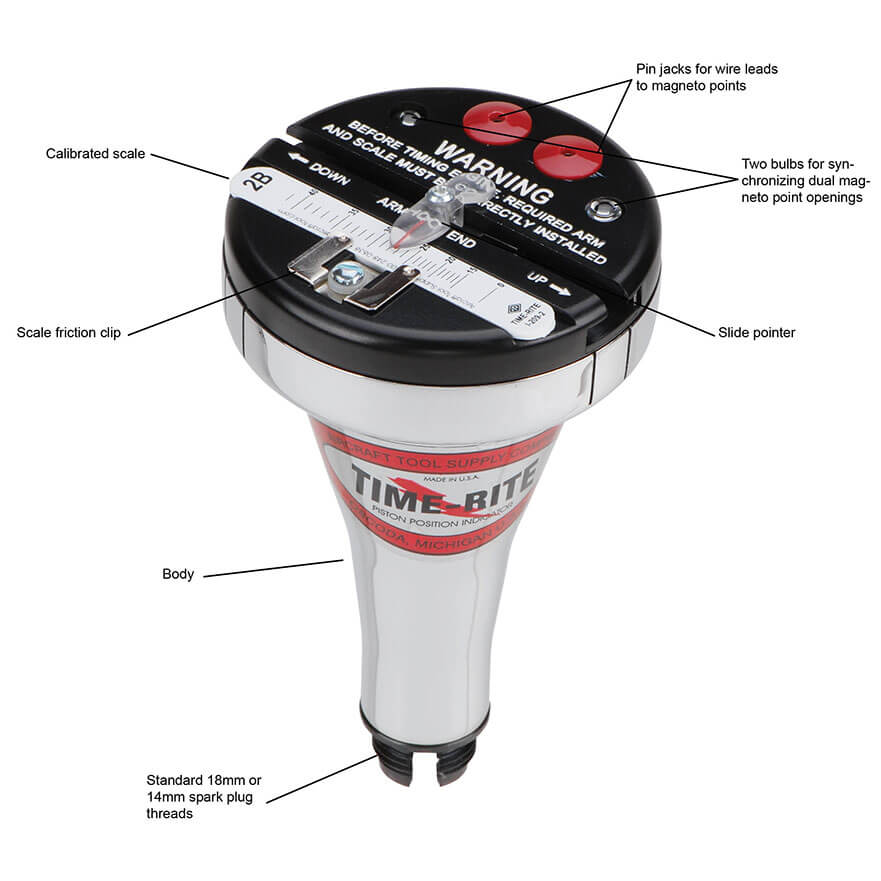 This complete kit includes the basic unit plus the complete set of Arms and Scales required to service 14mm engines. Time-Rite is an instrument designed for precision timing of aircraft engines by direct measurement of piston travel. The features of the Time-Rite design a moveable slide pointer, and an adjustable calibrated scale, eliminate the need for finding top dead center and compensate for the variables involved in accurate piston positioning. Calibrated scales are available for most types of engines, and scale calibrations are obtained in cooperation with, and are approved by the engine manufactures. Because of the difference in spark plug locations and piston dome shapes, different pivot arms are available to adapt the Time-Rite to most aircraft engines. All arms are easily interchanged. Carries a Lifetime ATS-Pro warranty. |
