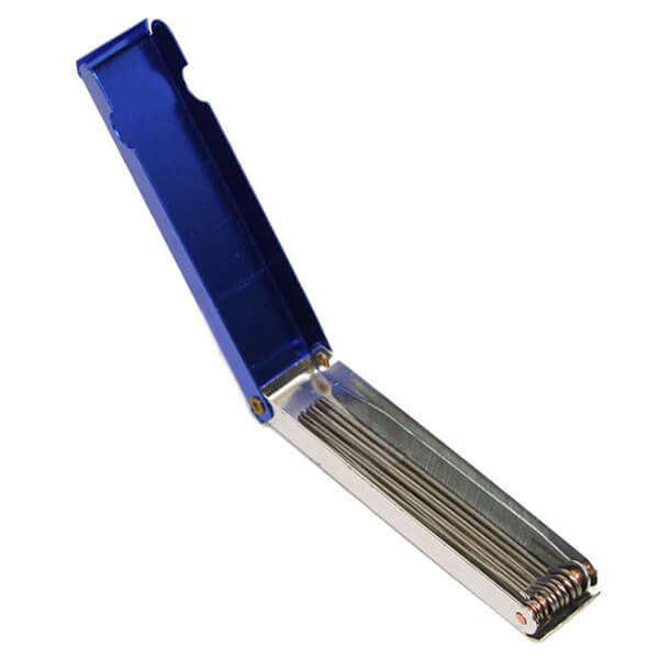 Quality aluminum case with rustproof stainless steel wire. The long spiral cleans a large number of tip styles. A hardened steel file included in each case. |