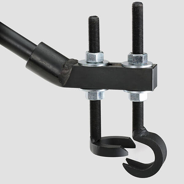 A simple and effective tool that makes compressing the valve spring for keeper removal a snap. Simply hook the "C" hook over the rocker shaft, locate the "L" hook over the spring cover plate, and press the handle downwards to compress the spring. The keeper can then be removed and the valve spring separated from the valve. To re-assemble, just perform the steps in reverse order to re-install the keeper. It's that simple. |
