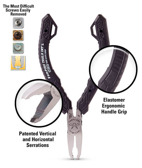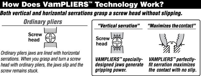 An extraordinary pair of pliers that incorporates patented and award winning VamPLIERS™ Mini Technology to solve screw extraction problems. VamPLIERS™ Mini have uniquely designed and patented concave shaped jaws with vertical and horizontal serrations on the inside jaws, which make it possible to grab on to a small stripped/rusted/corroded screw or rounded nut for extraction. VamPLIERS™ Mini will work on screws that have special, tamper-proof, or unique heads; like a Torx screw. They have smooth varnished finish and contains environmentally friendly elastomer for ergonomic grips. Manufactured in Japan, VamPLIERS are made of high quality carbon steel from Kobe, Japan. The world is held together with nuts, screws and bolts, which will need to be maintained, repaired, or replaced. Stripped, rusted, or rounded, the VamPLIERS screw remover is the perfect tool for every maintenance, repair & operation (MRO) technicians' tool box. VamPLIERS are great for professionals and D.I.Y.ers alike! |
