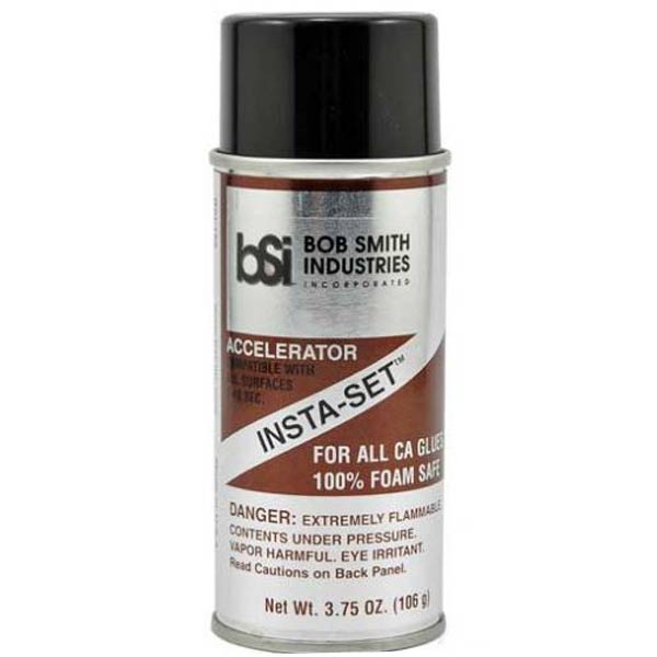 INSTA-SET™ is a catalyst which acts as an accelerator that allows CAs to quickly cure in thick layers by enhancing the alkaline conditions during polymerization. INSTA-SET™ in a spray bottle is normally used to cure the CA that flows from joints when parts are pressed together. Applying an additional bead of thick CA along a seam and then curing it with INSTA-SET™ significantly enhances a joint’s strength. For difficult to bond materials, INSTA-SET™ can be applied to one surface and CA to the opposite surface. When brought together, they will bond instantly. INSTA-SET™ is formulated with a strawberry scent and activates CA in 6 to 8 seconds without any degrading of the CAs strength, which can occur with many other accelerators. It is compatible with all surfaces, even clear plastic and white foam. The surface properties of some materials, such as being acidic or having very low moisture content, slow down the curing of cyanoacrylates. CA accelerator is formulated to harden CA in ten seconds or less. Accelerator allows large gaps to be filled in loose fitting joints and cures the excess CA that sometimes oozes out of joints so that objects can be handled within seconds without the worry of sticking one’s fingers to the parts. Accelerator makes the repair of household items much easier. |