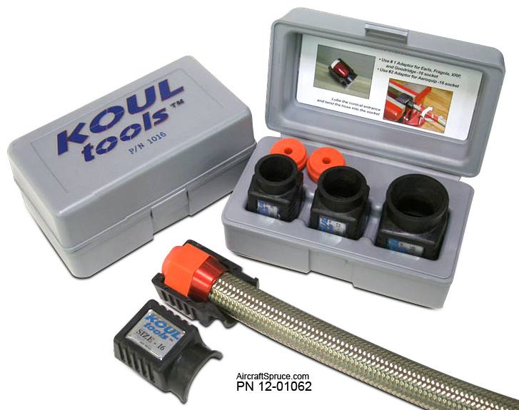 SMALL KIT The Small kit contains the capsules to install -4, -6, -8 hose into their respective sockets. To accommodate all the different manufacturer’s fittings, spacers and sleeves are required to tighten up the some of the sockets within the capsule. For the tool to perform at its best, the socket needs to be a snug fit in the funnel. The two spacers are used in some -6‘s and 8‘s. If the socket seems loose in the tool, use a spacer to tighten it up. In the small kit, only the Russell -4 needs a sleeve. Not for use with Teflon™ style hose. LARGE KIT The Large kit contains the capsules to install -10, -12, -16 hose into their respective sockets. To accommodate all the different manufacturer’s fittings, spacers and sleeves are required to tighten up some of the sockets within the capsule. For the tool to perform at its best, the socket needs to be a snug fit into the funnel. In the 1016 kit, all the -16’s except Russell’s require the sleeve and a rear spacer. See the instructions in the case for the proper spacer number. Most of the -10’s and 12’s* will use a spacer. Not for use with Teflon™ style hose. * -12 is a stainless washer. |
