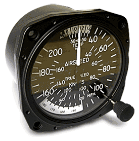 The true airspeed indicator corrects the indicated airspeed for changes in temperature and pressure encountered as aircraft changes altitude. By aligning outside temperature and pressure altitude with setting knob, movable airspeed scale is rotated proper amount so pointer registers true airspeed. Factory new 8100 series by United. TSO’D for certificated aircraft. Dual scale. |